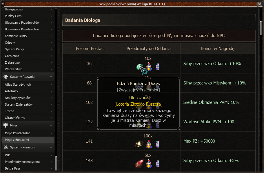 - W misjach Aszary na zaliczanie Dungeonów Skorpiona(6%) i Nagini(4%) dodano szansę na wcześniejsze zaliczenie